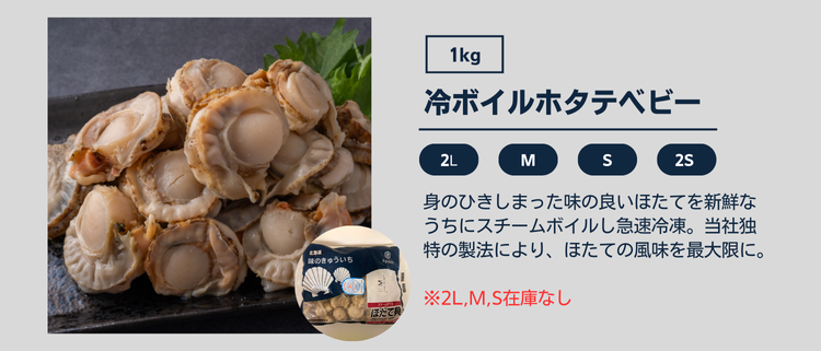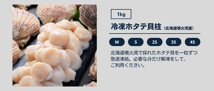 北海道内で取れた新鮮な海産物を、人の目で質を確認し、高い鮮度・色合い・完熟度などを保つように急速冷凍しています。
