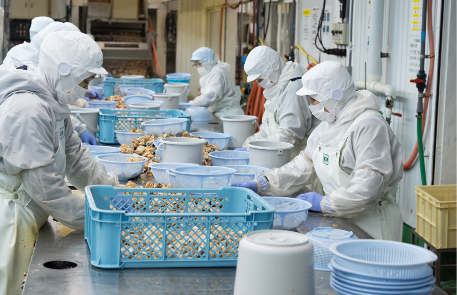 きゅういちのほたては、人の手で丁寧に殻を剥き、最新のトンネルフリーザーで、1粒ずつ個別に急速冷凍をしています。-40℃で瞬間的に凍結するため、細胞が破壊されず旨味そのままでお届けします。