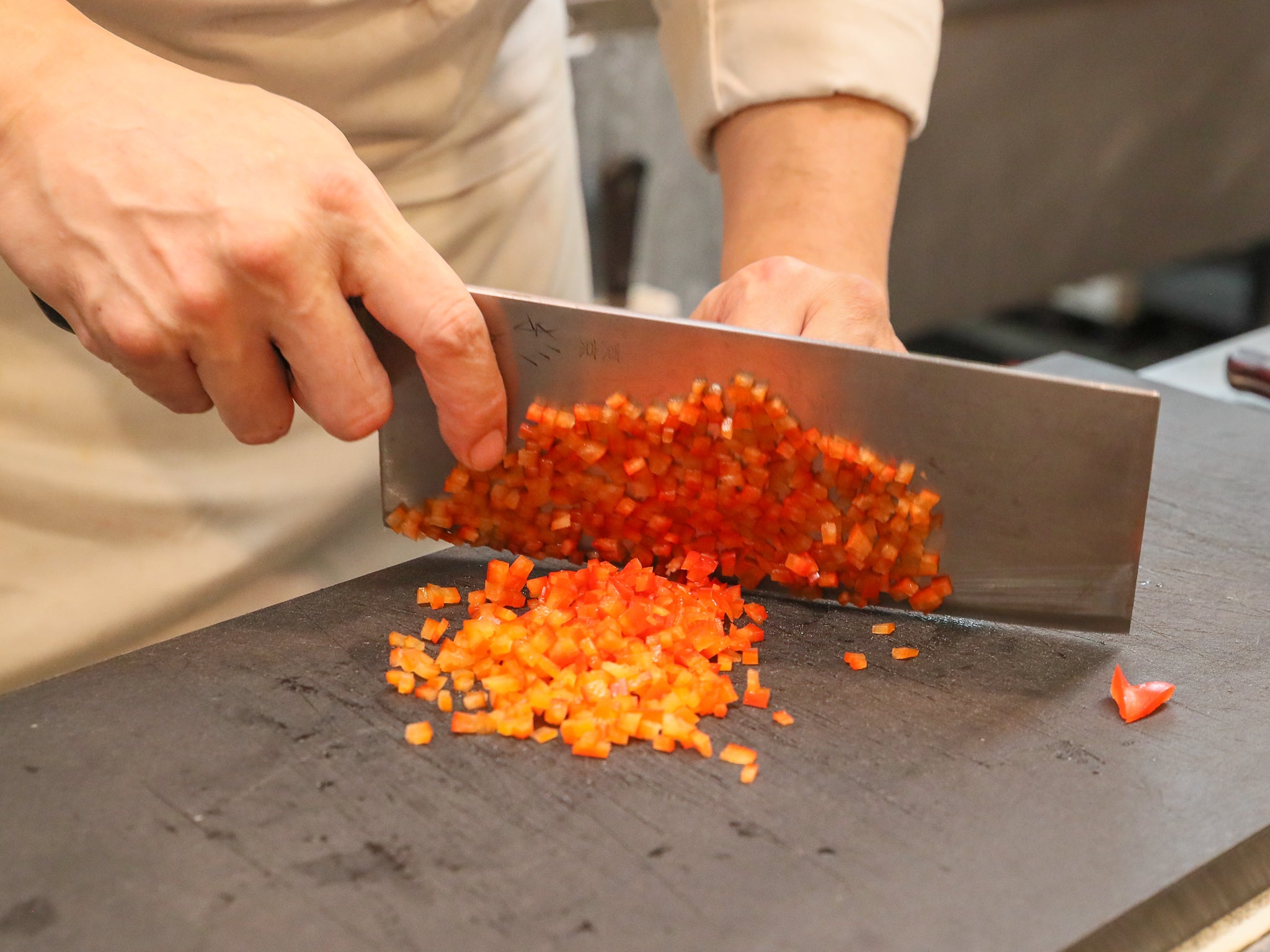 - 赤パプリカをみじん切りにして適量の塩に漬け水分を出しキッチンペーパーなどで水気を絞っておく。