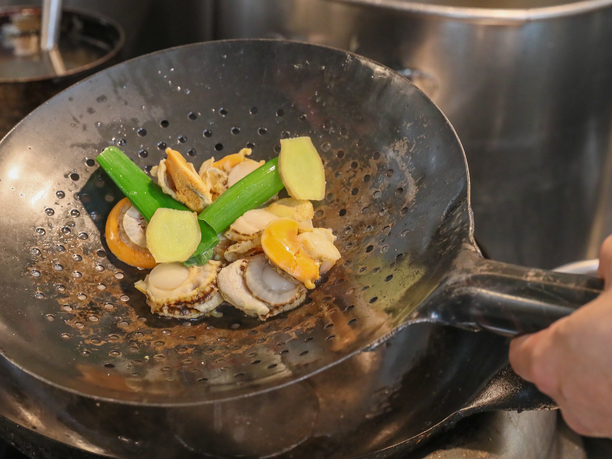 手順1:ボイルホタテは臭みを取るため長ネギ、生姜、塩、酒を入れ沸騰したお湯で湯掻く。