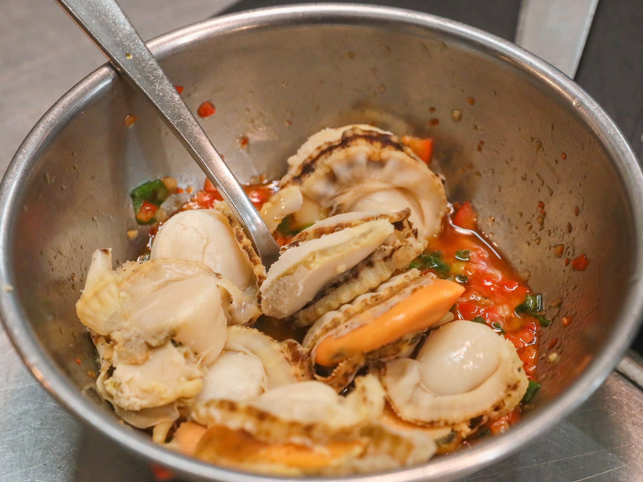 大粒のボイルホタテを使い、シンプルにソースと和えただけのお手軽レシピ。ボイルホタテを一度湯掻いて臭みを取るなどシェフの繊細な技でワンランク上の味わいに。